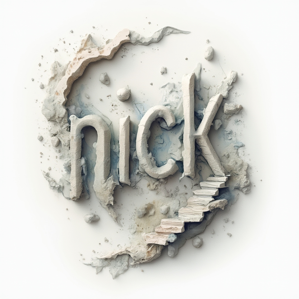 The name "nick" becomes an impossible surreal structure, with melting, floating, and looping forms on a white background.