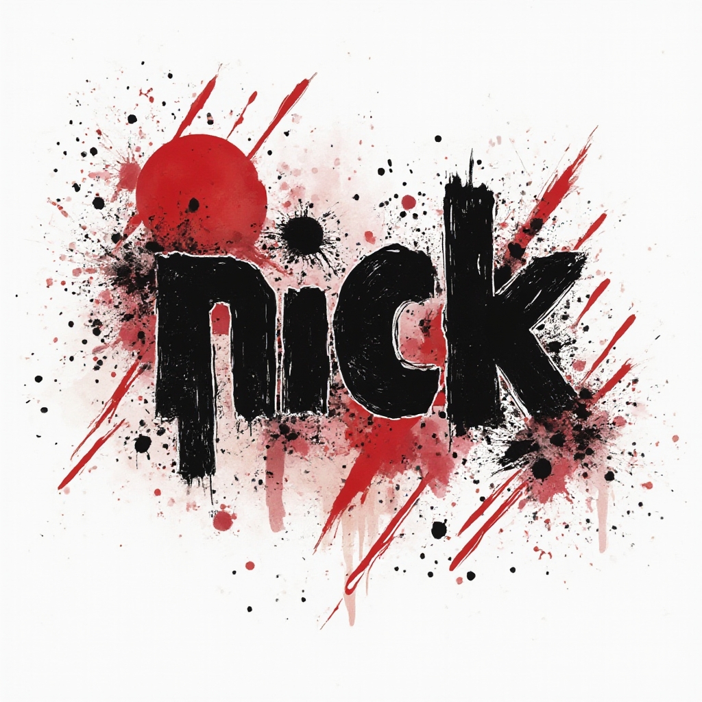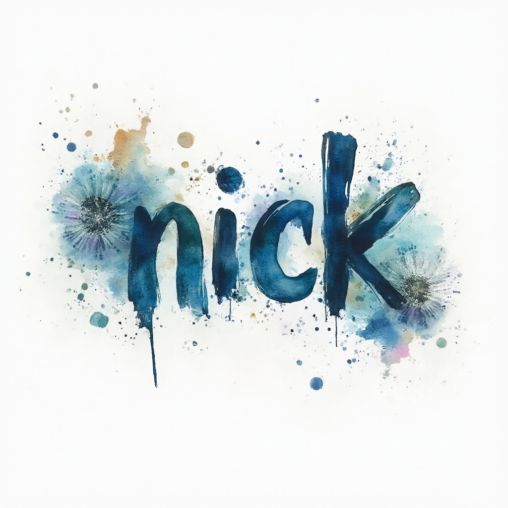 The name "nick" emerges from flowing watercolor strokes, defined by soft blends, splashes, and translucent pigment on pure white.