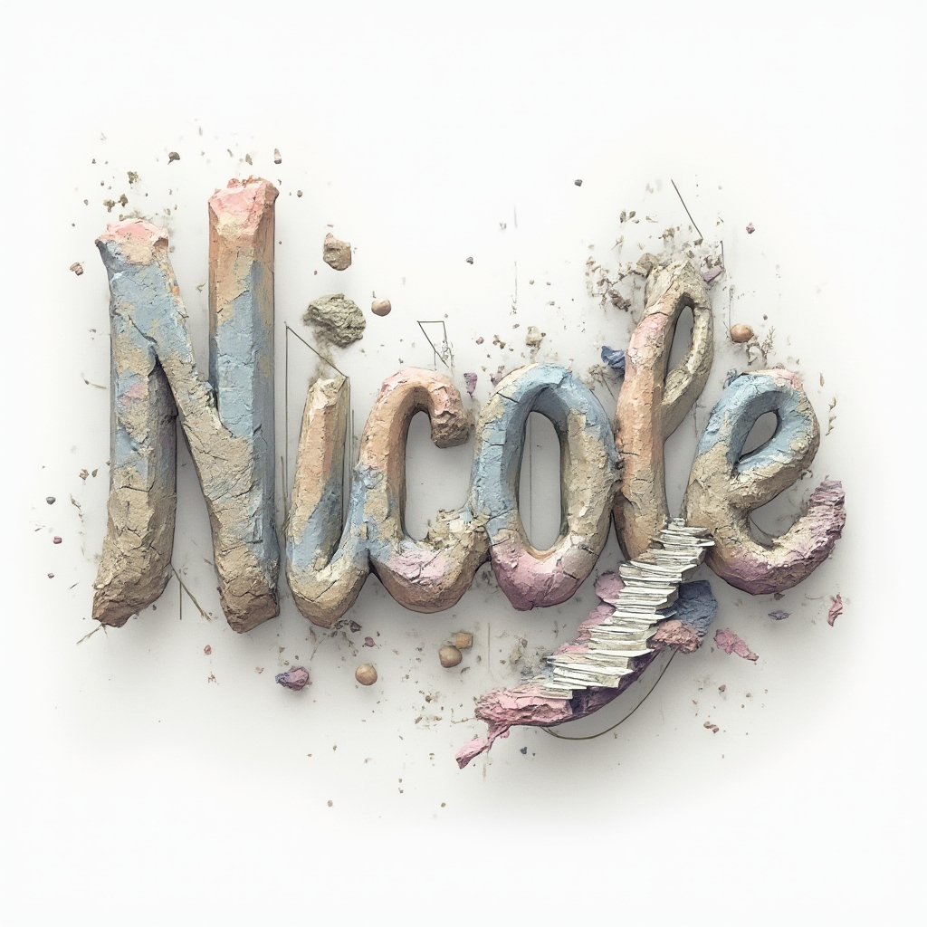 The name "nicole" constructed as a surreal landscape of impossible shapes, floating fragments, and dreamlike architecture.