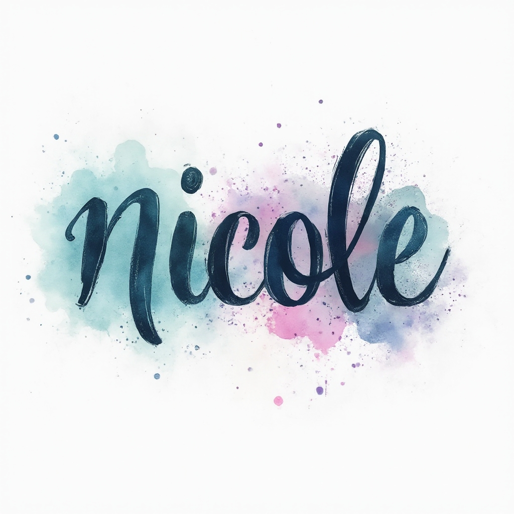 The name "nicole" painted in expressive watercolor brush lettering, dissolving into vibrant splashes and gradients.