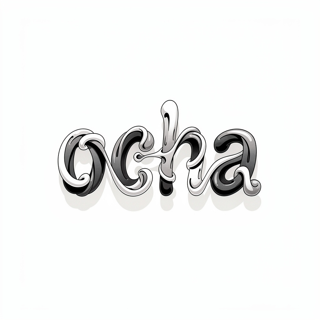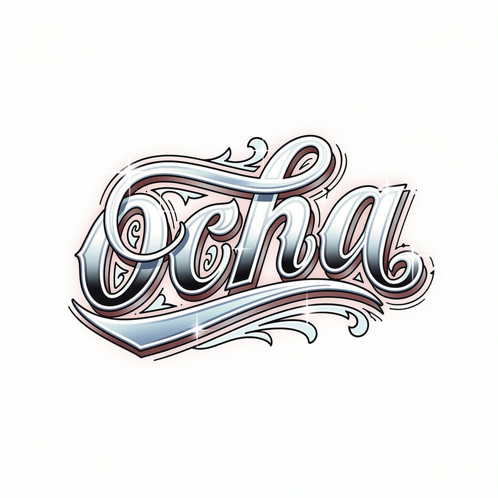A surreal lettering tattoo where the name Ocha morphs into dreamlike, impossible shapes.