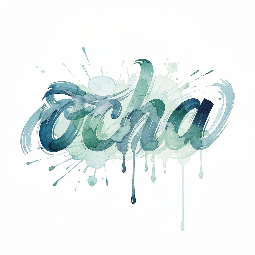 A dreamy watercolor tattoo concept where the name Ocha dissolves into washes of color and painterly strokes.