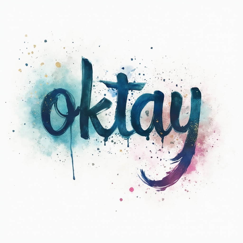A vibrant watercolor-inspired tattoo concept where the name “oktay” becomes fluid brushstroke lettering surrounded by colorful splashes and gradients.