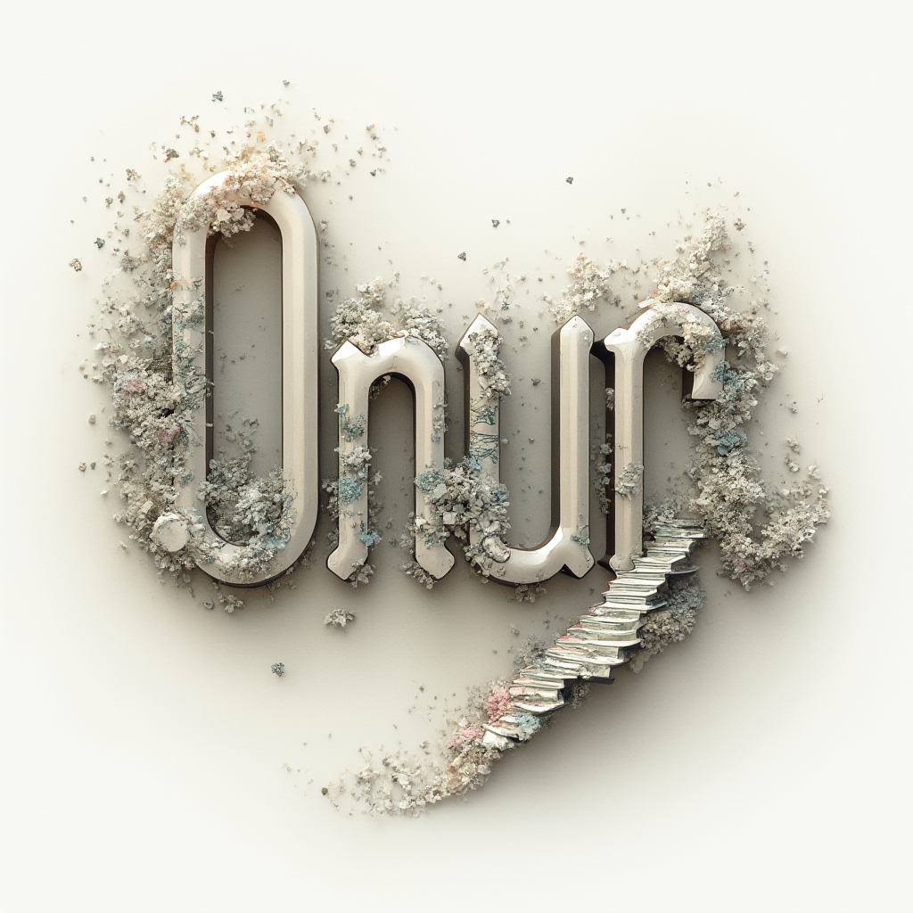 A surreal dreamscape where the letters of 'onur' are built from impossible objects and floating architecture.