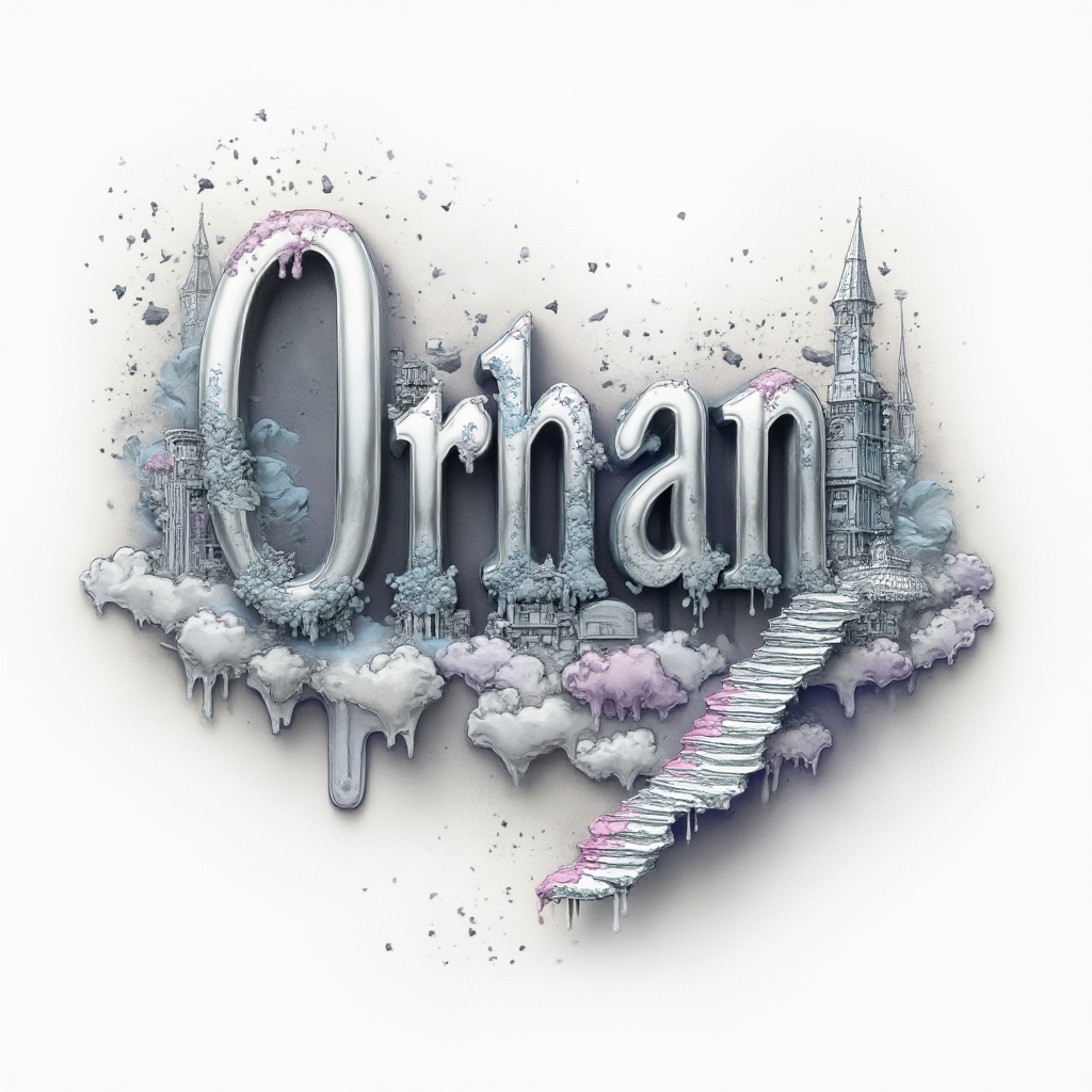 A surreal dreamscape where the word "orhan" twists into impossible architecture and fluid forms on a white background.