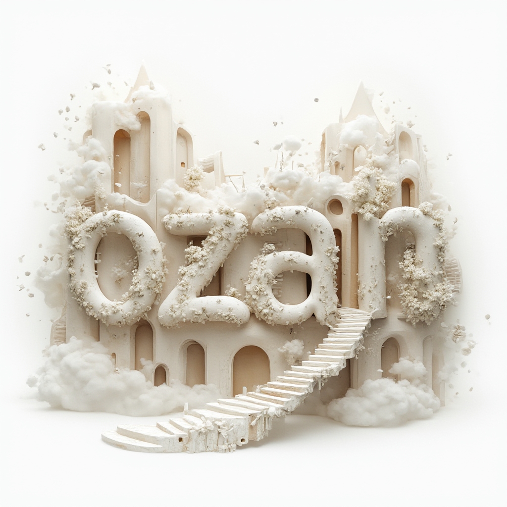 A surreal dreamscape where “ozan” is constructed from gravity-defying, impossible structures and abstract forms floating in empty space.