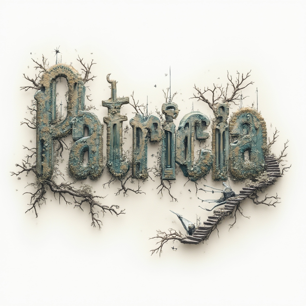“Patricia” appears as a surreal structure made of staircases, melting clocks, and branches, forming dreamlike lettering on a white background.