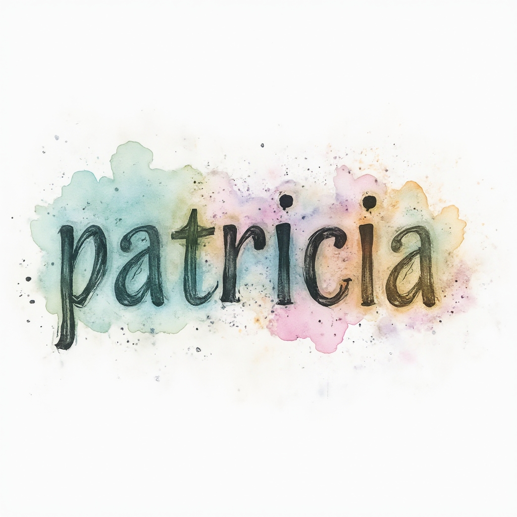 The name “patricia” flows as vivid watercolor brushstroke lettering with soft blends, drips, and splashes on a clean white background.