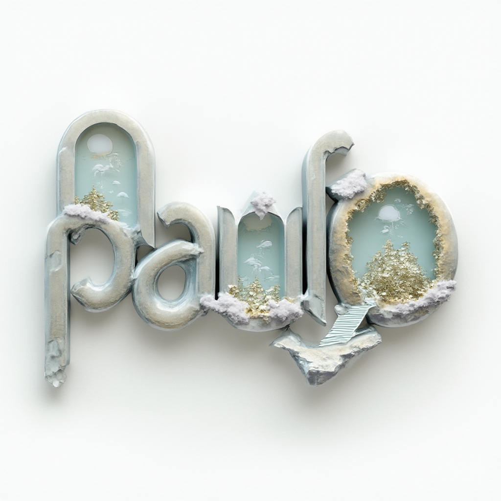 A surreal reimagining of "paulo" as floating, impossible structures, blending liquid metal, clouds, and miniature worlds into each letter.