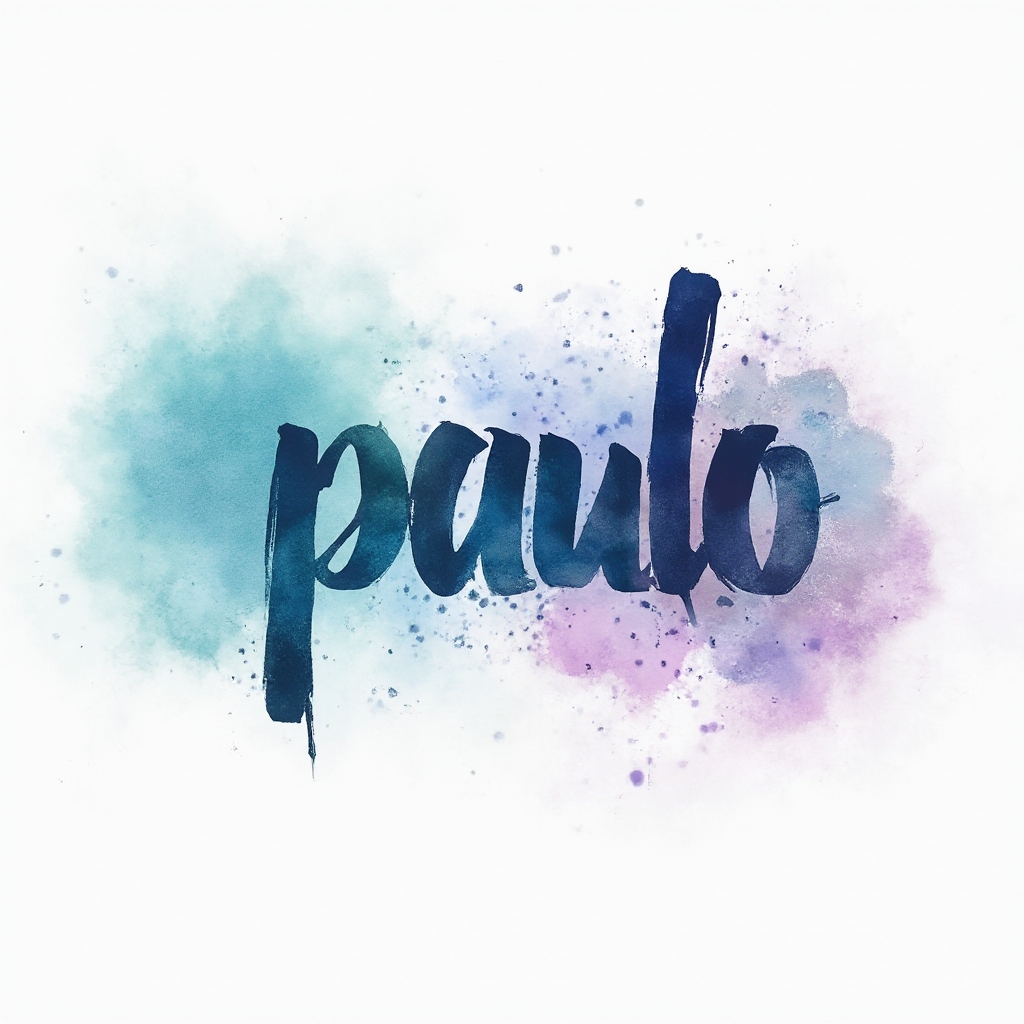 A soft, flowing watercolor interpretation of "paulo" with brush-stroke letters, paint splashes, and dreamy gradients on a white background.