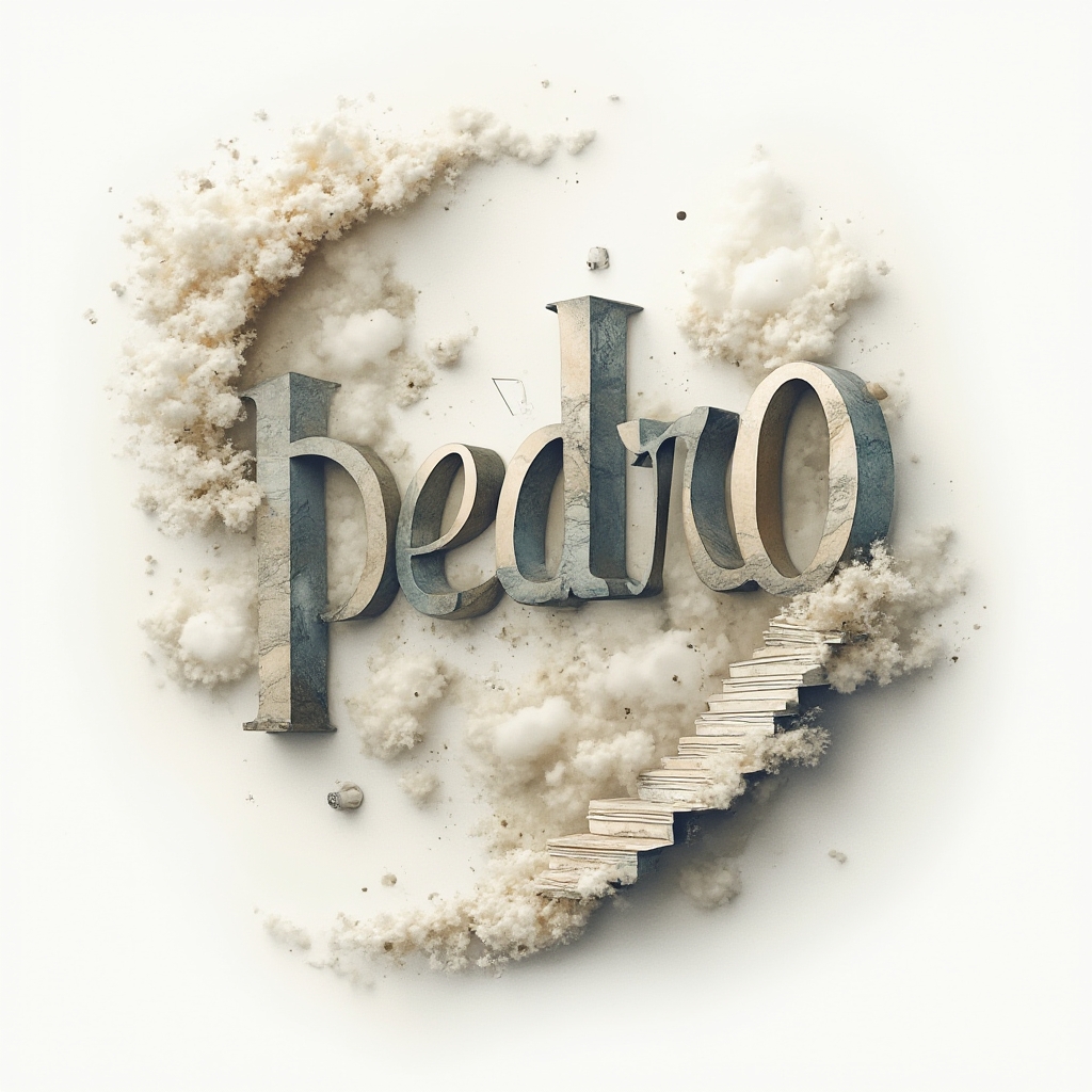 A dreamlike surreal structure in which the letters of “pedro” twist into impossible architecture suspended in white space.
