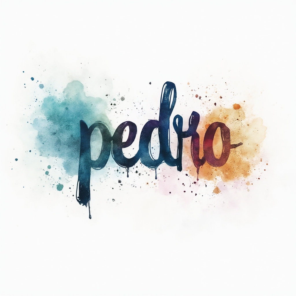 A fluid, colorful watercolor composition where abstract splashes and brushstrokes merge to form the name “pedro.”