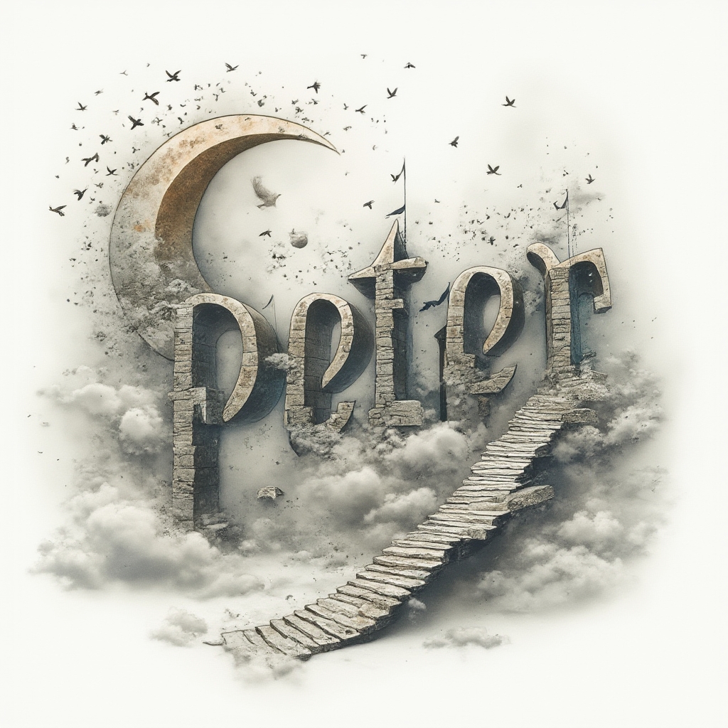 The name ‘peter’ emerges from a surreal dreamscape of arches, clouds, and impossible shapes.