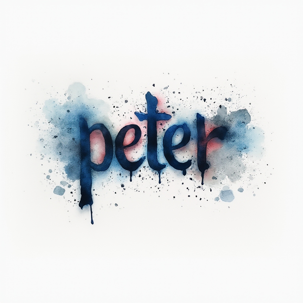 The name ‘peter’ appears as fluid watercolor lettering, built from splashes, drips, and soft gradients.