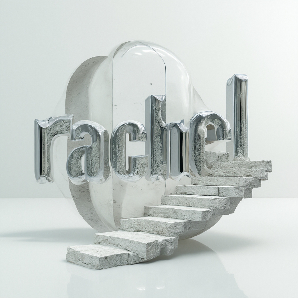 A surreal tattoo concept that turns each letter of rachel into impossible objects and structures floating in a blank, dreamlike white space.