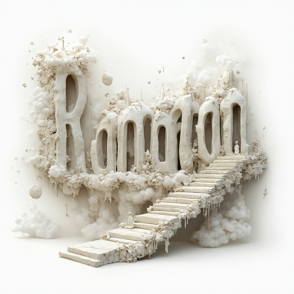 A surreal, dreamlike composition where architectural forms and floating elements twist together to spell ‘ramazan’.