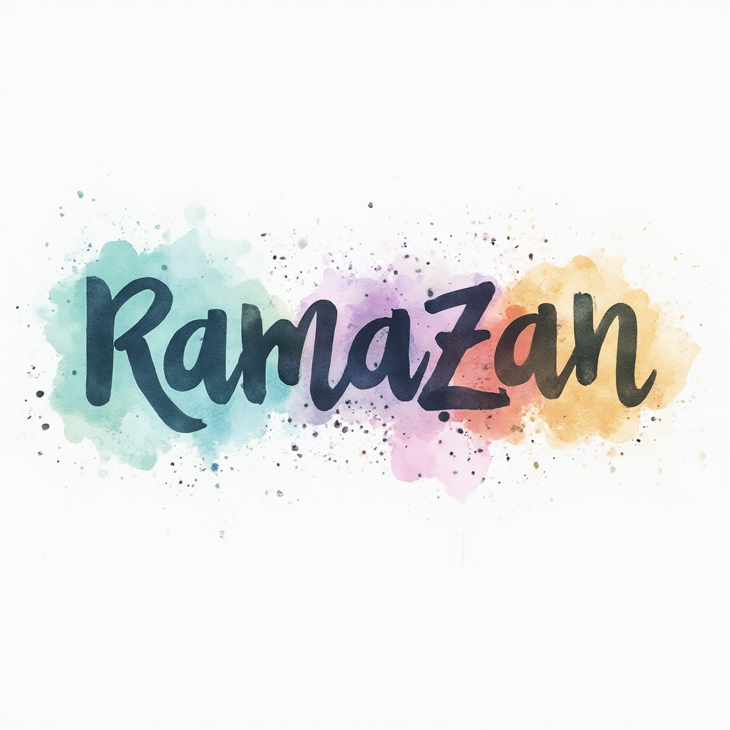 A soft, colorful watercolor-inspired design where ‘ramazan’ flows as painted letterforms dissolving into splashes and gradients.