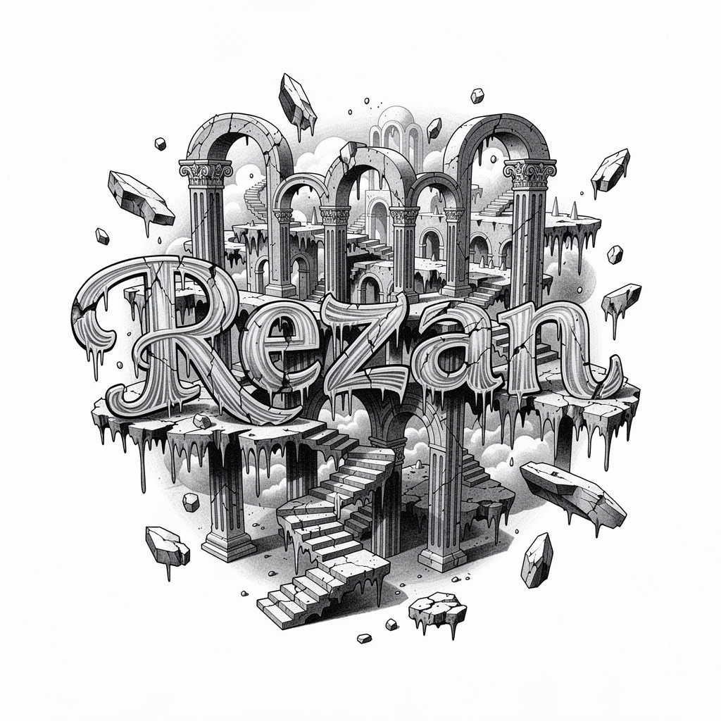 A surreal, mind-bending tattoo concept that transforms the name Rezan into a floating, impossible structure full of depth and visual intrigue.