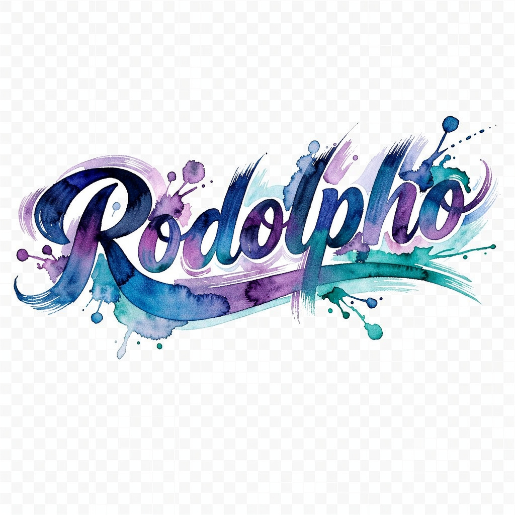 A fluid watercolor tattoo composition where the name Rodolpho appears as vivid, blended brush strokes.