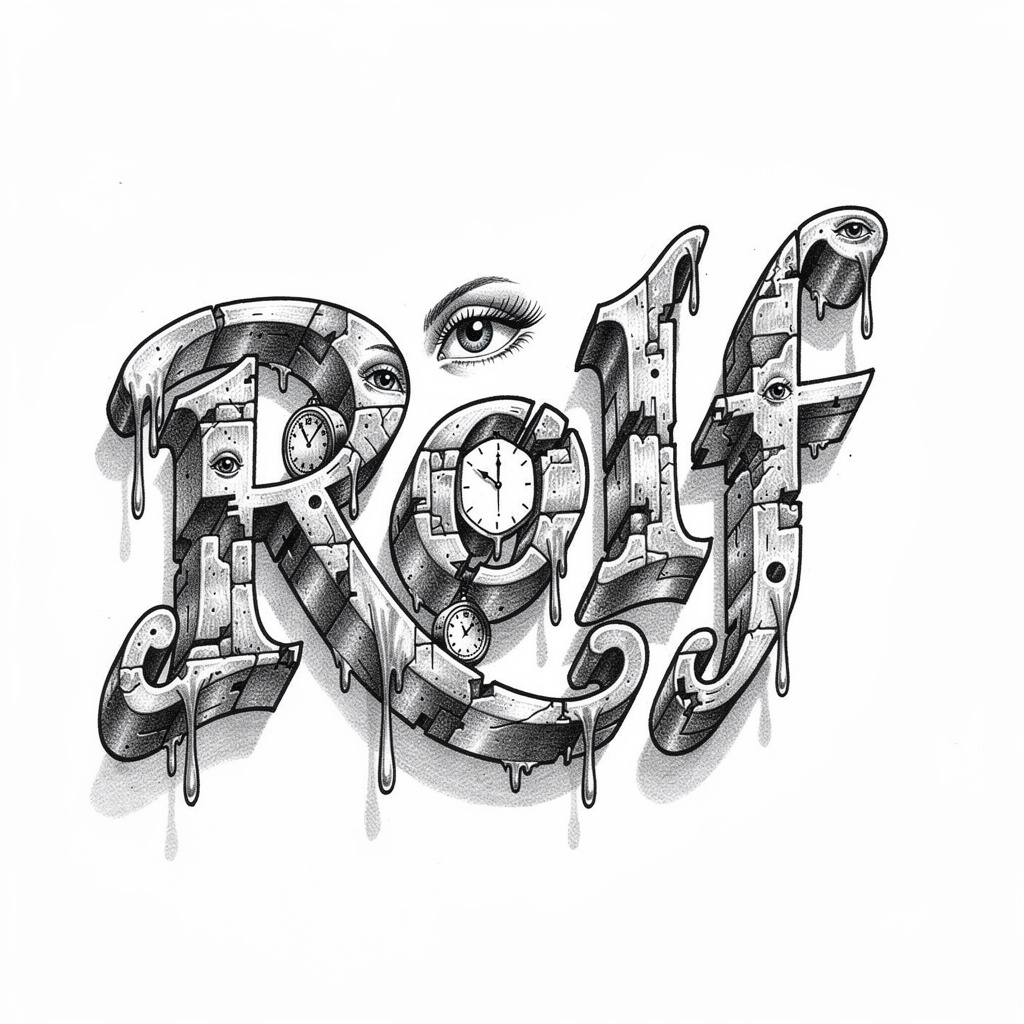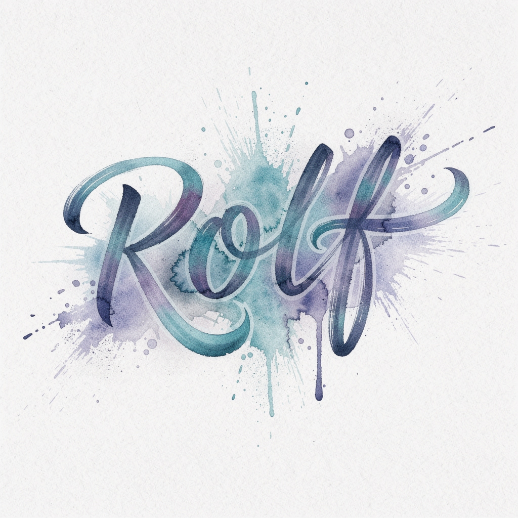 A soft yet dynamic watercolor tattoo concept where the name Rolf is fully shaped by painterly strokes, splashes, and gradients.