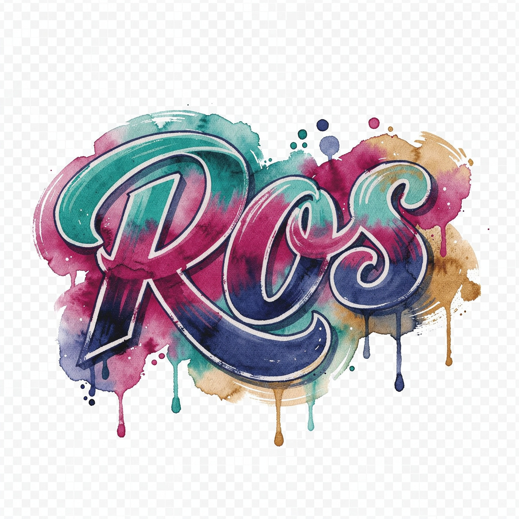 A fluid, colorful watercolor tattoo rendering of the name Ros, where the letters themselves appear painted in soft, blended pigments.