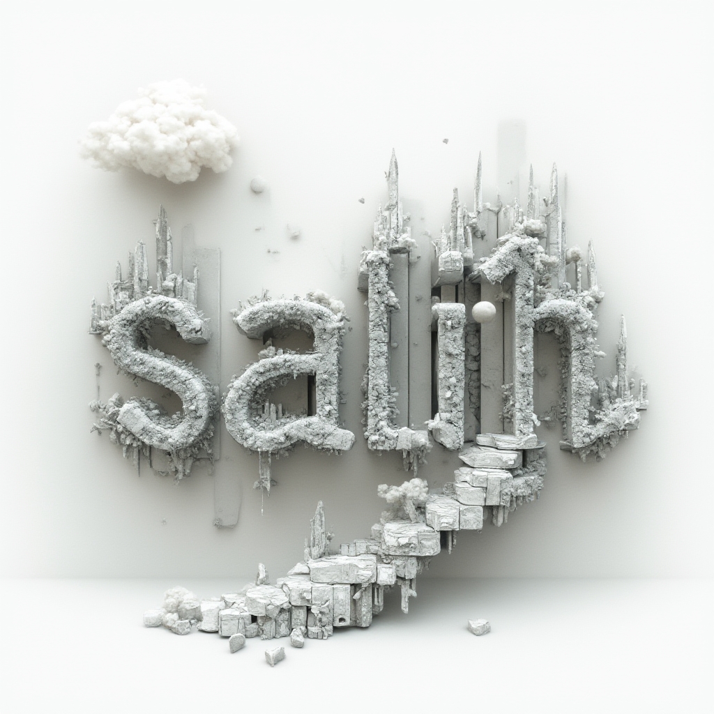 A surreal, impossible landscape where the letters of "salih" become floating architectural forms and melting structures.