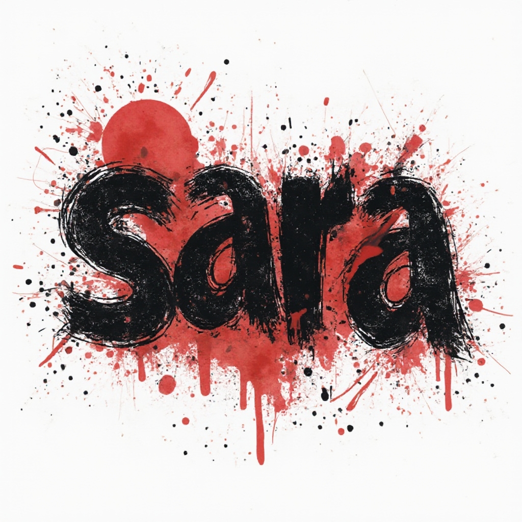 A soft watercolor tattoo concept where “sara” is painted in flowing, blended brushstroke letters with splashes and bleeds.