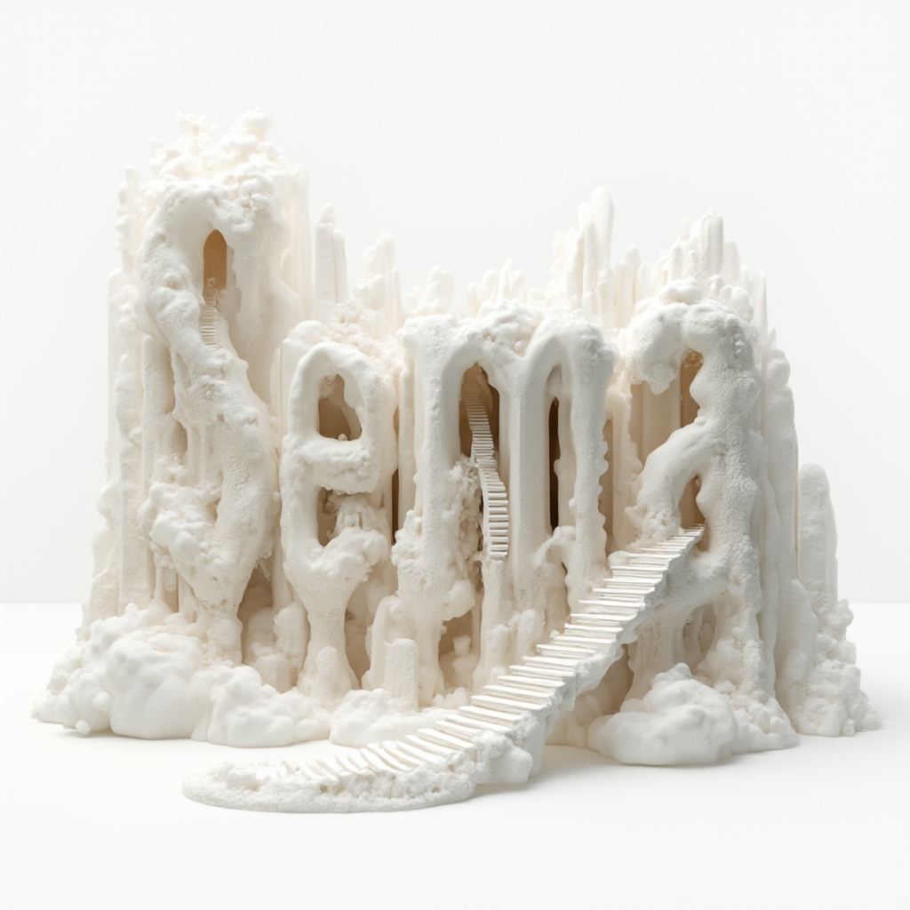 A surreal tattoo concept where sema appears as melting, dreamlike architectural letters filled with impossible staircases and floating forms.