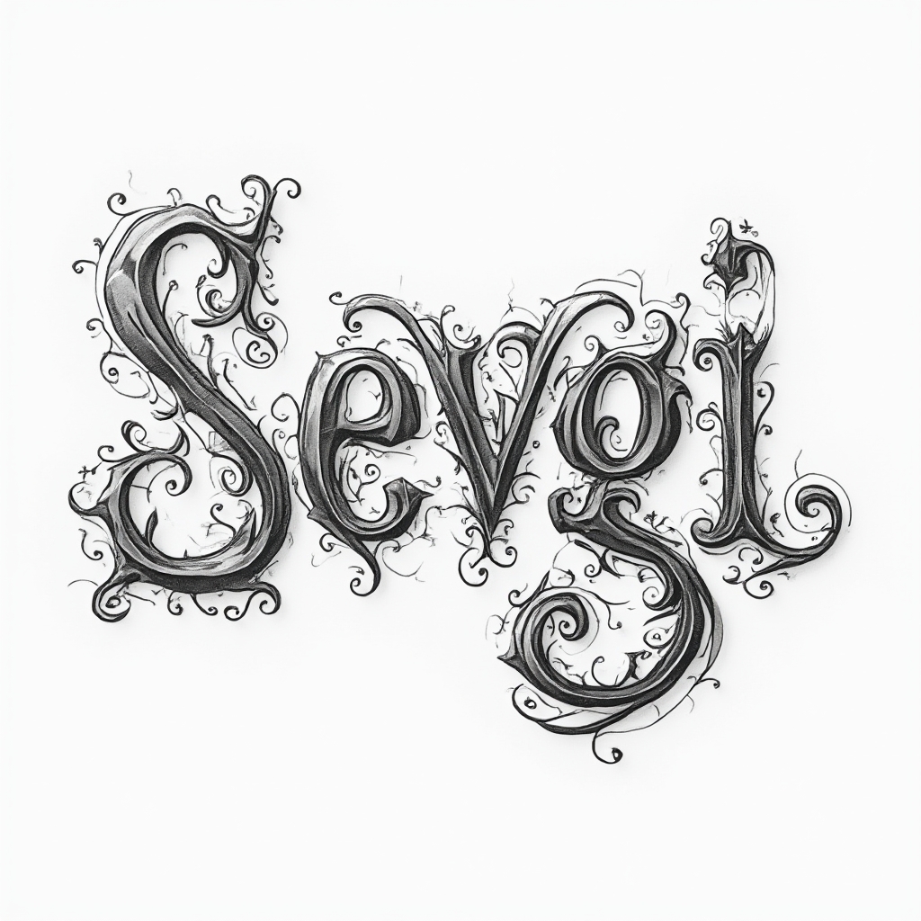A surrealism-inspired tattoo design with "sevgi" shaped from impossible, dreamlike objects and textures floating on a white background.