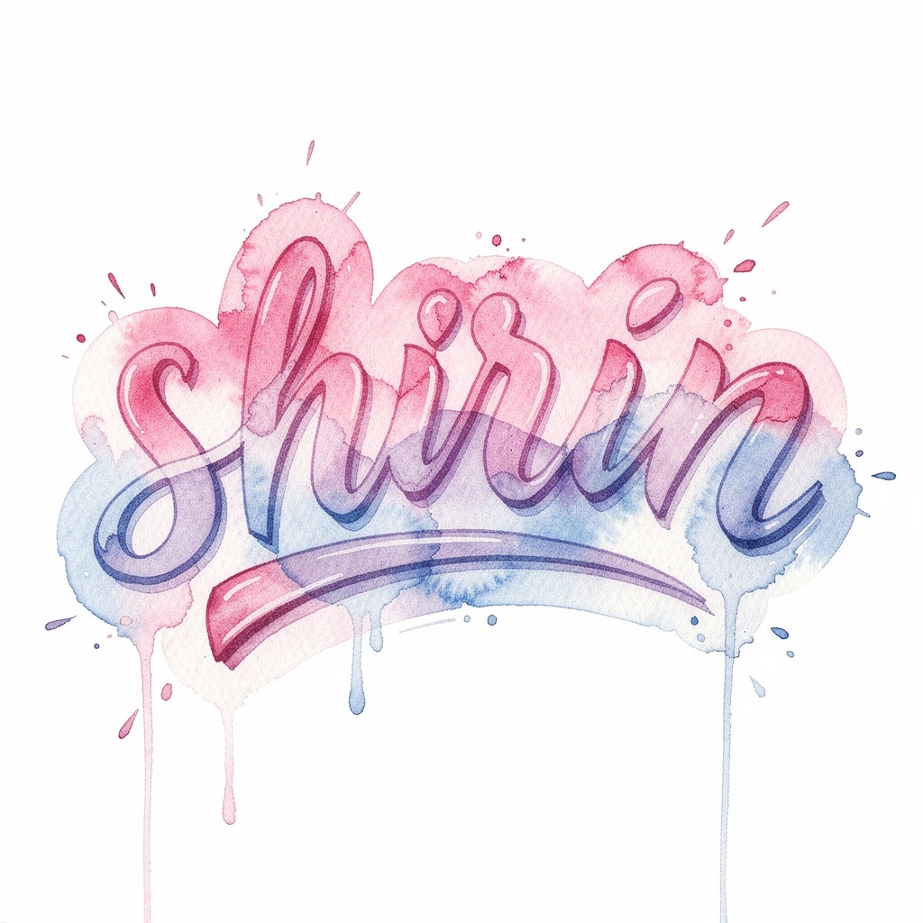 A soft watercolor-style tattoo concept where the name Shirin appears as flowing, painterly lettering in blended pastel hues.