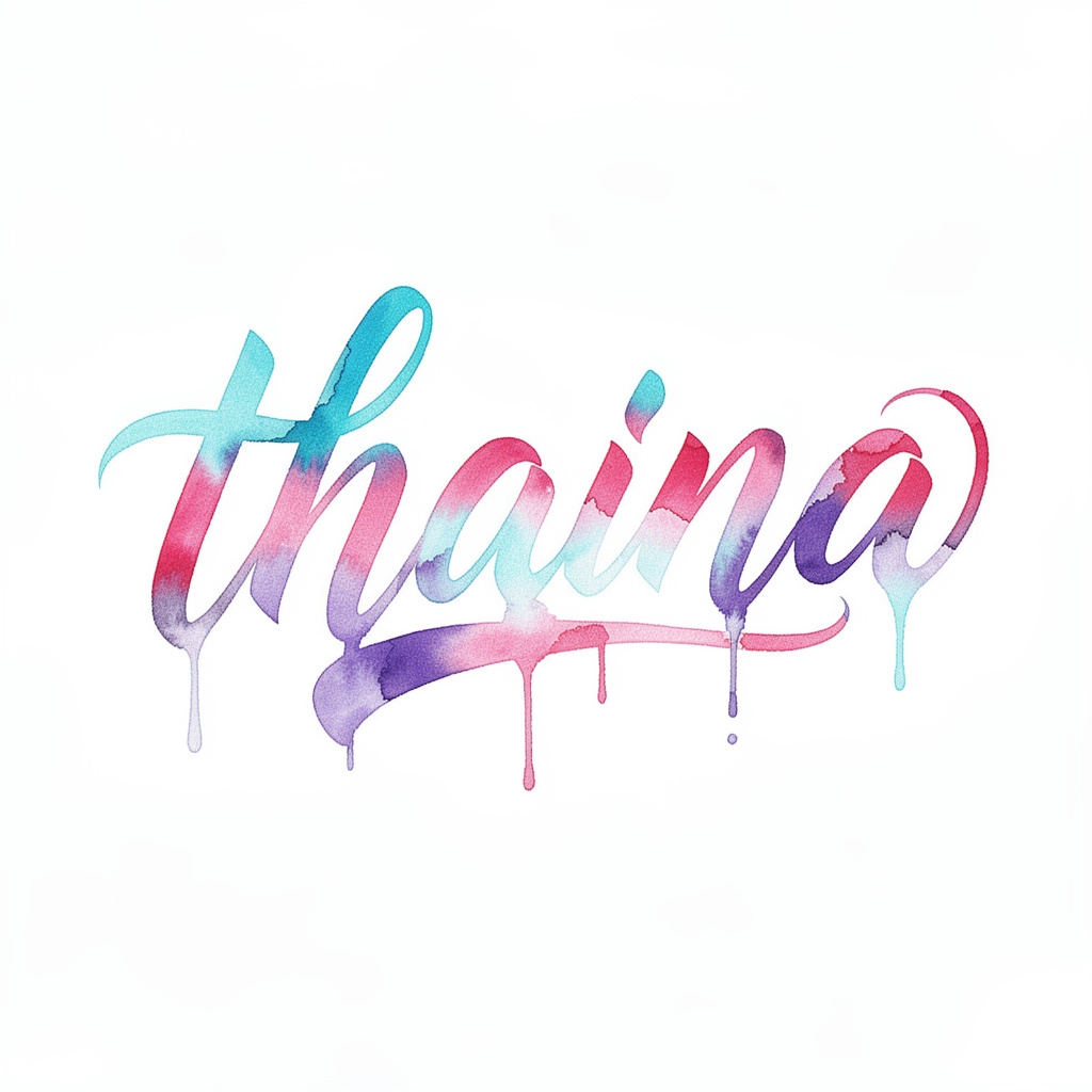 A vibrant watercolor-style tattoo concept where the name Thaina is painted as fluid, colorful brushstrokes.
