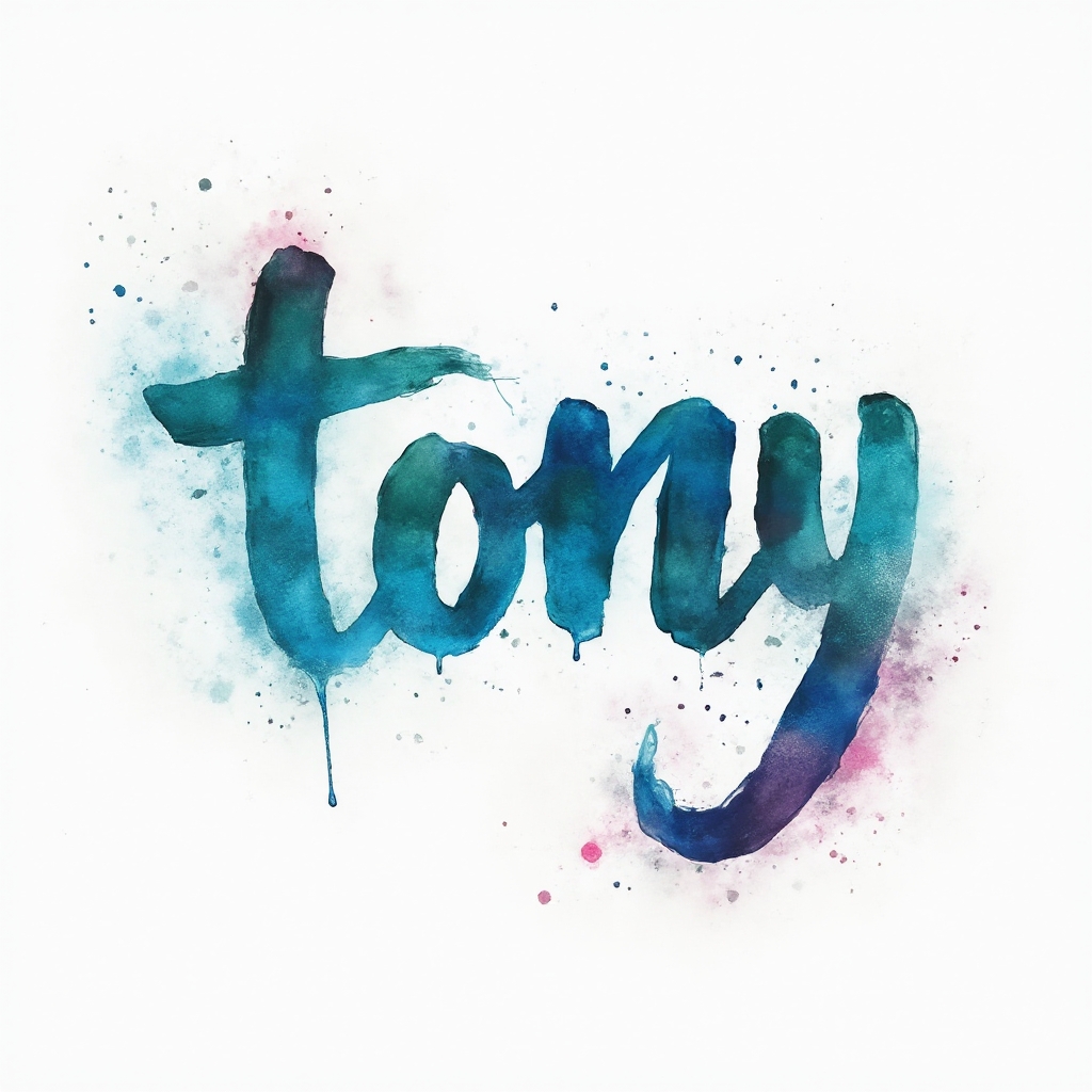 A vibrant watercolor tattoo concept where the name tony is painted with fluid ink strokes and colorful splashes on a clean white background.