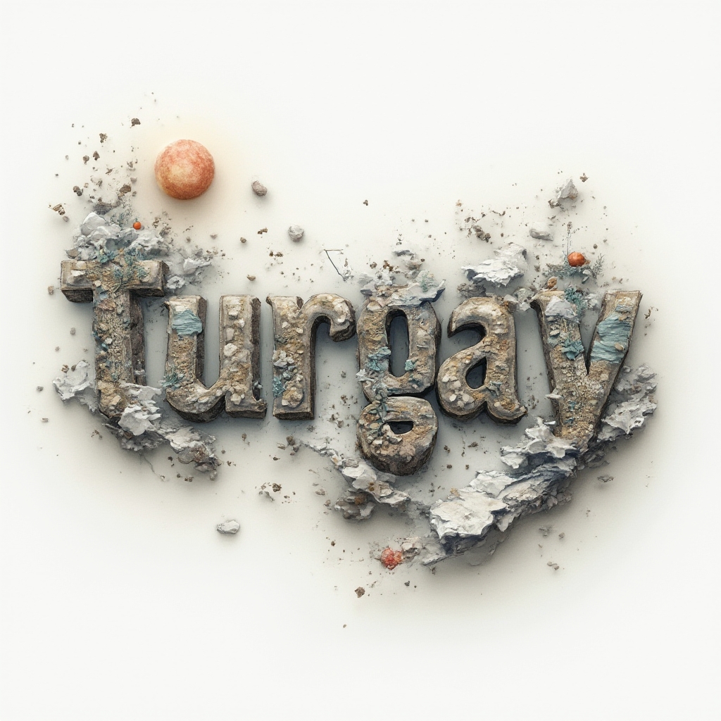 A surrealist concept where the letters of “turgay” become impossible objects, miniature worlds, and dreamlike structures in one cohesive design.
