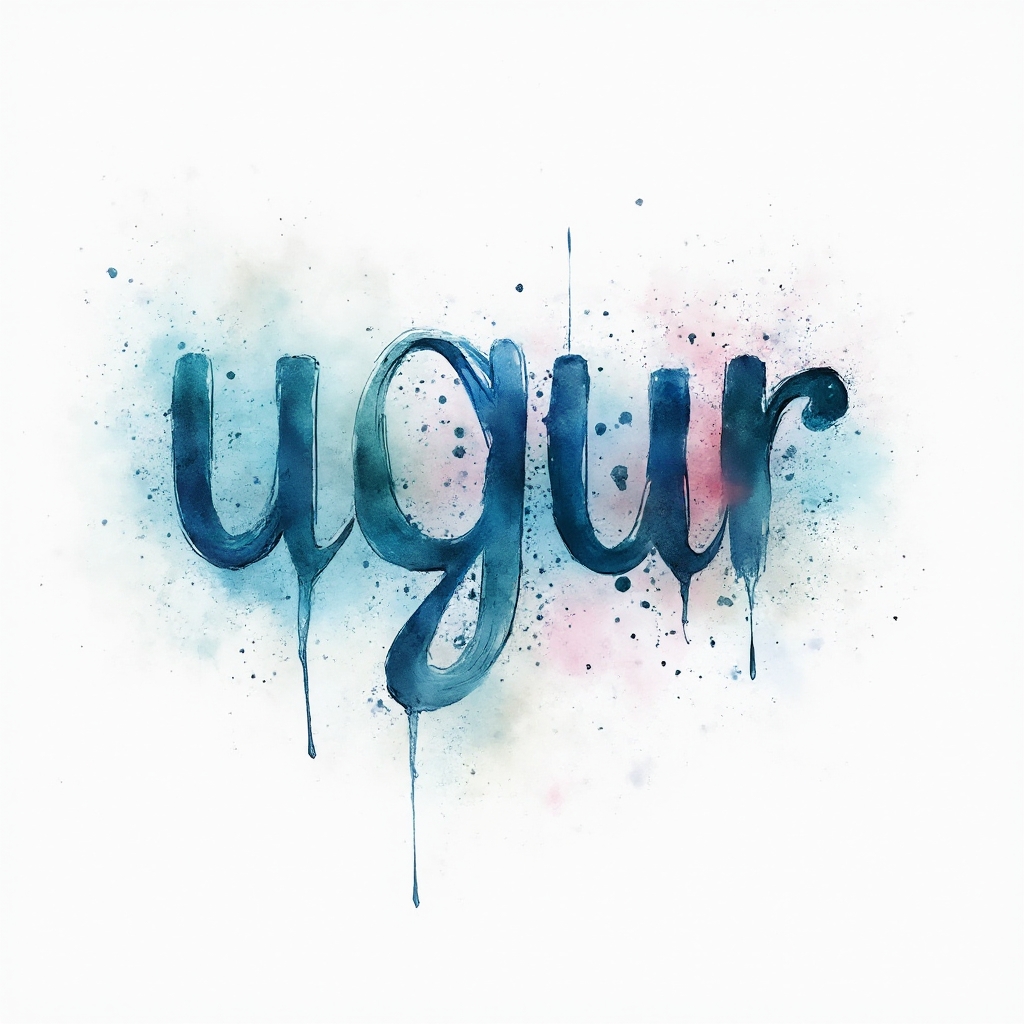 A vibrant watercolor-inspired tattoo concept where fluid brushstroke lettering and splashes form the name ugur on a clean white background.