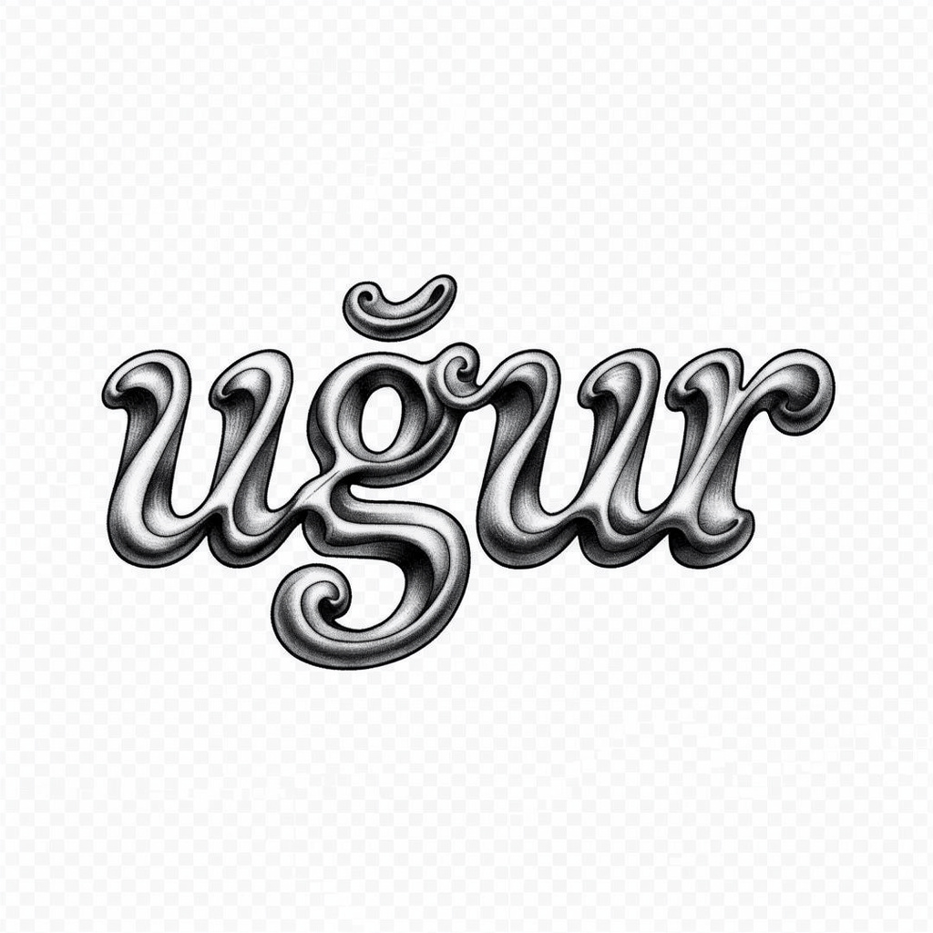 A surreal, abstract black-and-gray tattoo design that turns the name Uğur into fluid, dreamlike letterforms.