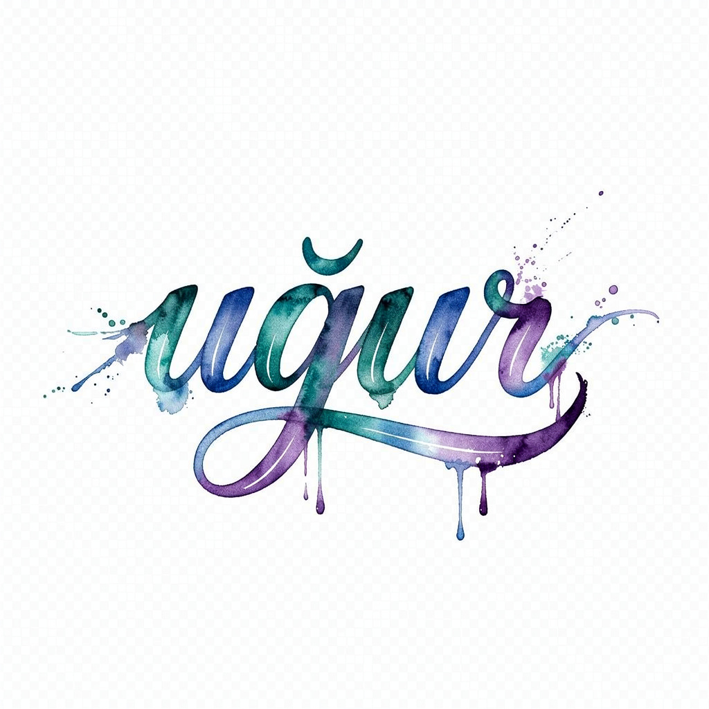 A soft, painterly watercolor tattoo design where the name Uğur appears as fluid, colorful brushstrokes.