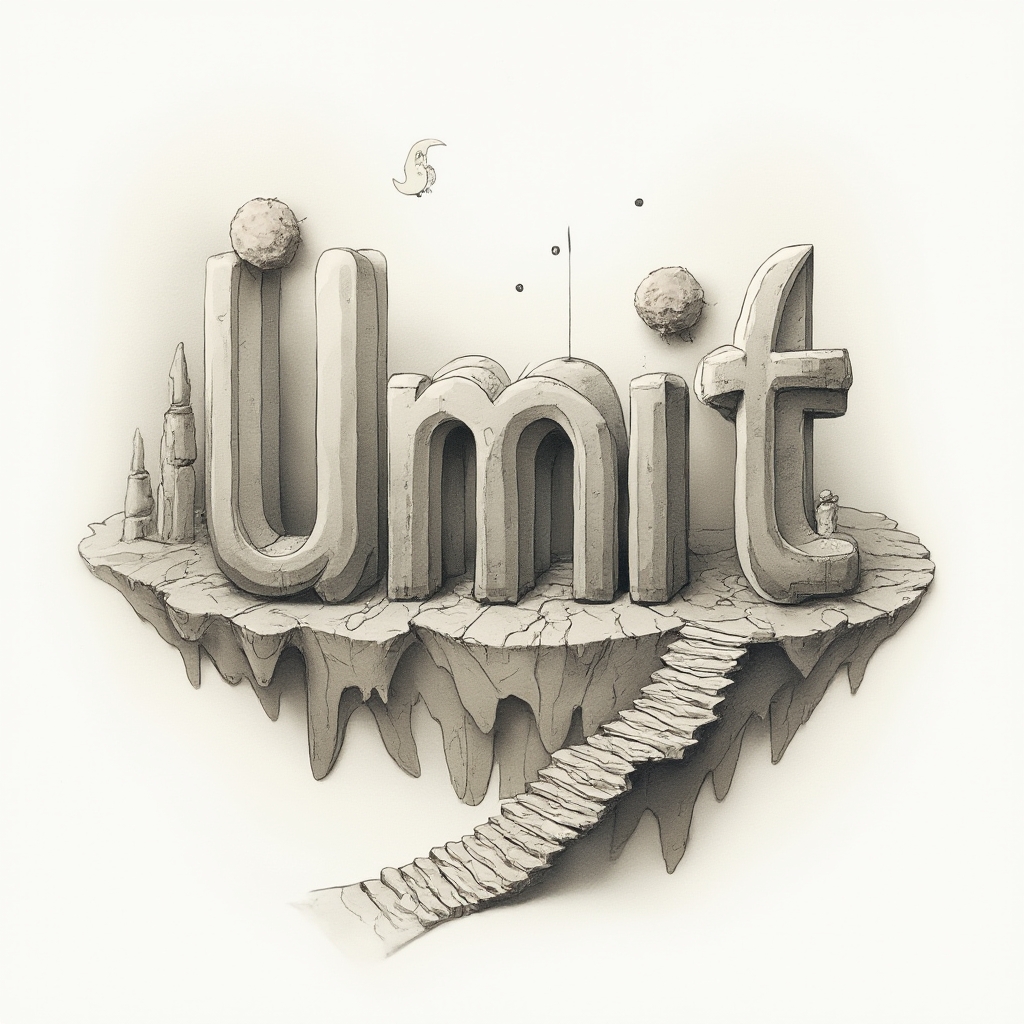 A surreal landscape where impossible structures and floating forms secretly build the name “ümit.”