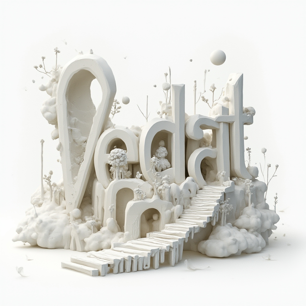 A surrealist tattoo concept turning the name "vedat" into an impossible architectural and dreamlike form with floating elements on a white background.