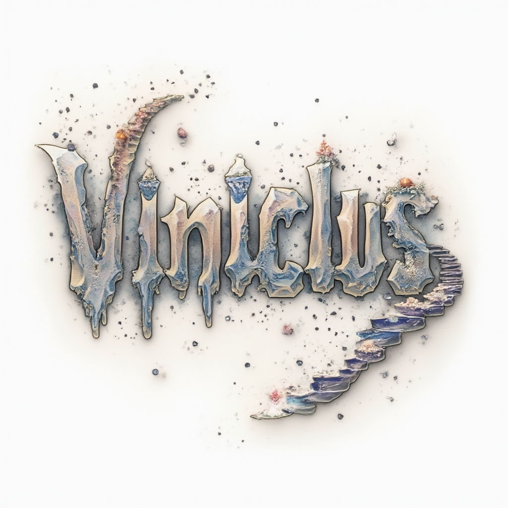 A surreal lettering tattoo design where vinicius appears as a dreamlike structure of impossible shapes and liquid forms on white.