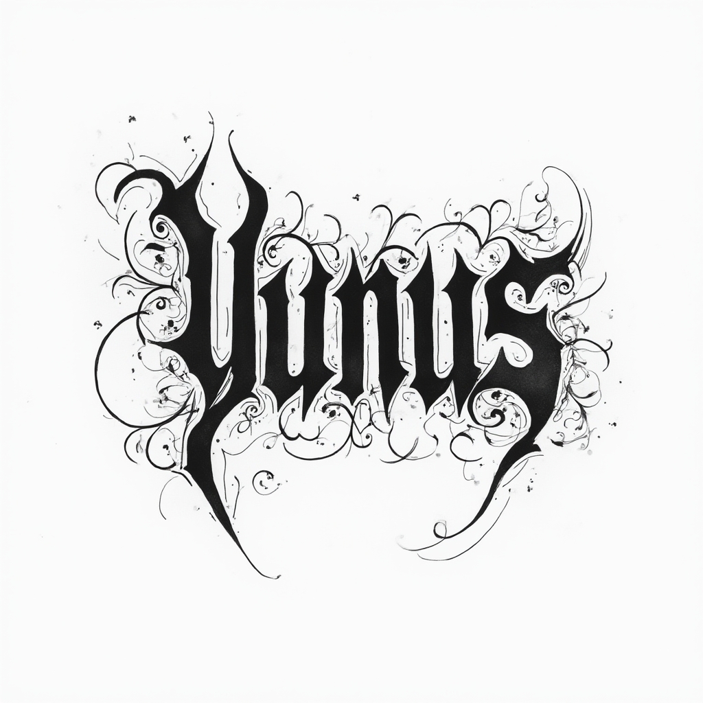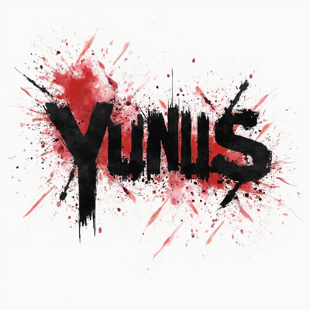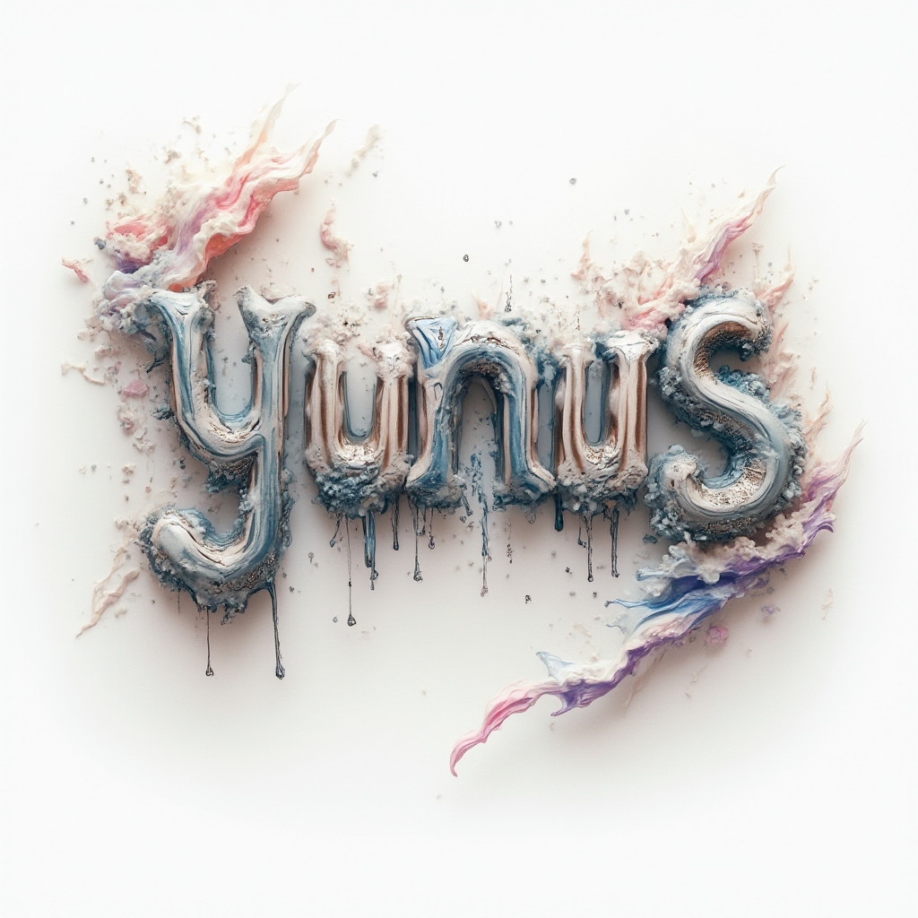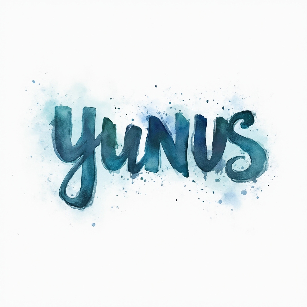 The name "yunus" rendered as soft, flowing watercolor calligraphy with vibrant gradients and delicate splashes.