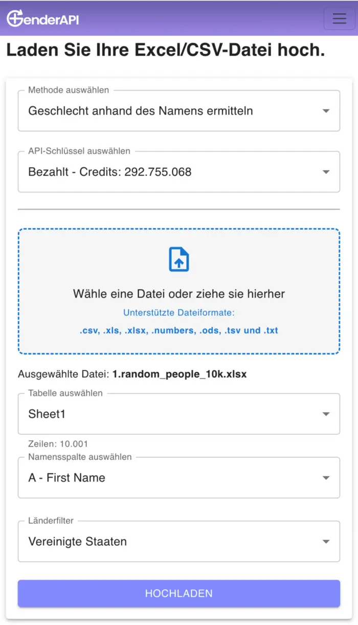 Bereiten Sie Ihre Datei mit Namen oder E-Mails vor, melden Sie sich bei Ihrem GenderAPI-Konto an, wählen Sie die passende Methode (z. B. Name, E-Mail oder @Benutzername) und klicken Sie auf Upload.
