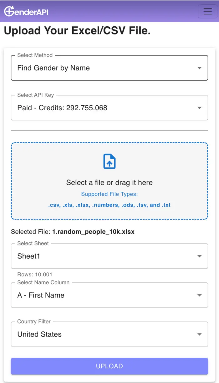 Valmistele ensin Excel/CSV-tiedosto, jossa nimet tai sähköpostit ovat yhdessä sarakkeessa. Kirjaudu sitten GenderAPI-tilillesi, valitse sopiva menetelmä (nimi, sähköposti tai @käyttäjätunnus), valitse tiedosto ja napsauta Lataa.